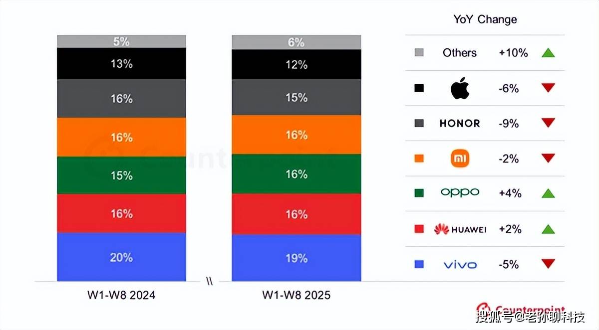 每年第三季度前期,在苹果新机发布前都迎来“黎明前的黑暗”,国内销量大幅下滑,直到新机亮相才能逆转颓势。市场调研机构Counterpoint Research发布最新数据,2025年第三季度前8周销量公布,小米等国产品牌销量下滑,华为逆势增长,苹果和预期一样销量掉队跌出前五名。